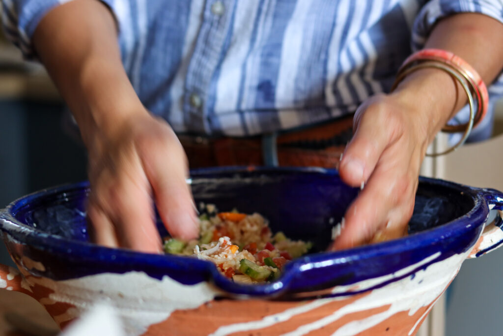 - Préparation du déjeuner avec des produits biologiques en circuit-court issus du potager de son maraicher, Damien Tourre et d’une tarte crue aux fraises pour le dessert. La tarte crue a été réalisée avec les délicieux oléagineux de Bedouin et avec le chocolat de la Chocolaterie Castelain. Des artisans locaux partenaires de notre séjour.