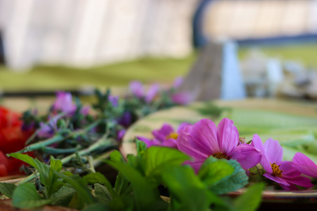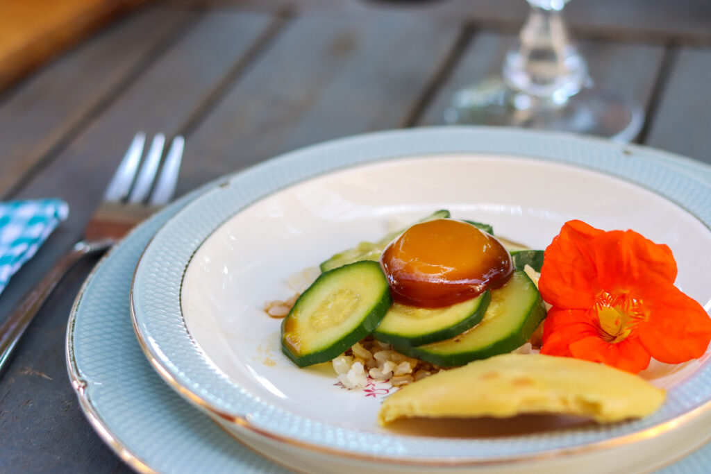 Il faut savoir que Bénédicte a pensé cet éco-lieu comme un laboratoire écologique et un lieu d’accueil. Ici, on peut proposer des stages, des formations ou bien venir en immersion pendant quelques jours. L’idée est de sensibiliser les gens à l’écologie et à la cuisine vivante. C’est d’ailleurs Bénédicte qui est derrière les fourneaux et qui prépare de délicieux plats sains, frais, vivants & végétariens.