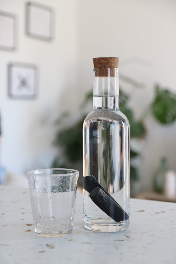 Une fois que vous avez bien respecter ces étapes, vous pouvez ensuite placer votre bâtonnet dans une bouteille en verre et la remplir d’eau potable du robinet. Laissez le charbon agir pendant 8 heures minimum et buvez votre eau sereinement.