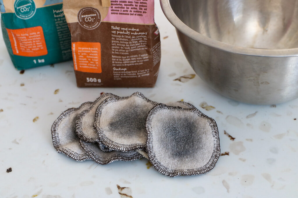 - Saupoudrez 2 cuillères à soupe de percarbonate de soude sur vos disques ce qui va permettre de rendre vos disques démaquillants plus blanc.