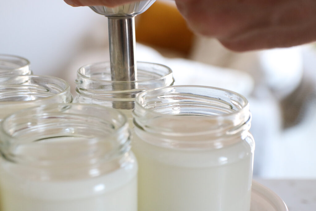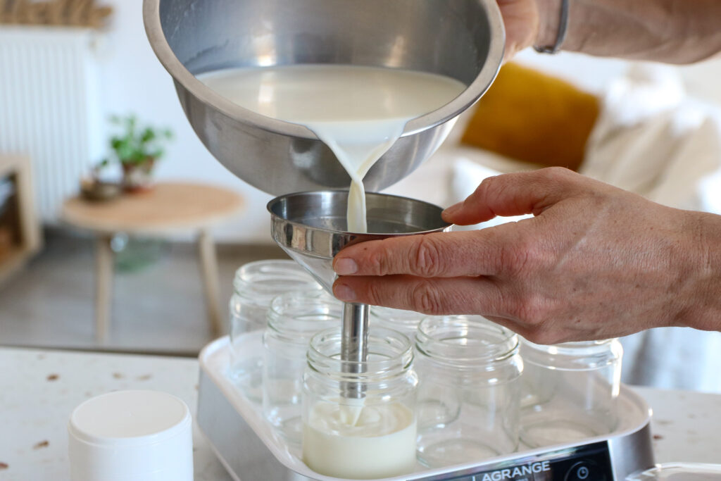 Mélangez les ingrédients ensemble et coulez vos yaourts dans vos pots en verre. Refermez votre yaourtière et lancez la fermentation (ne pas couvrir les yaourts pendant la fermentation).