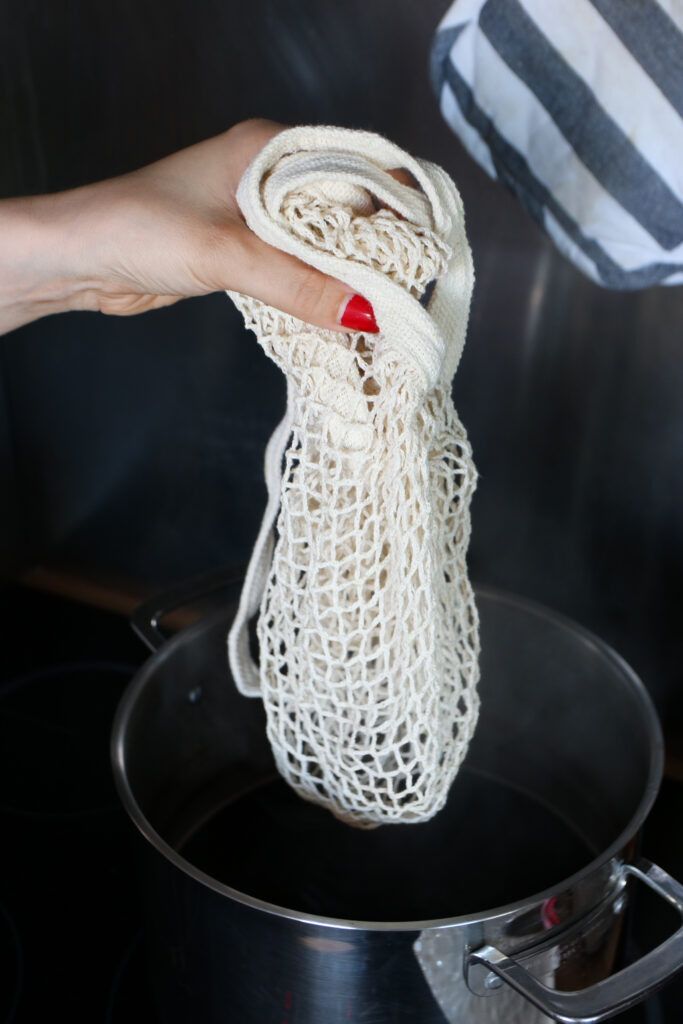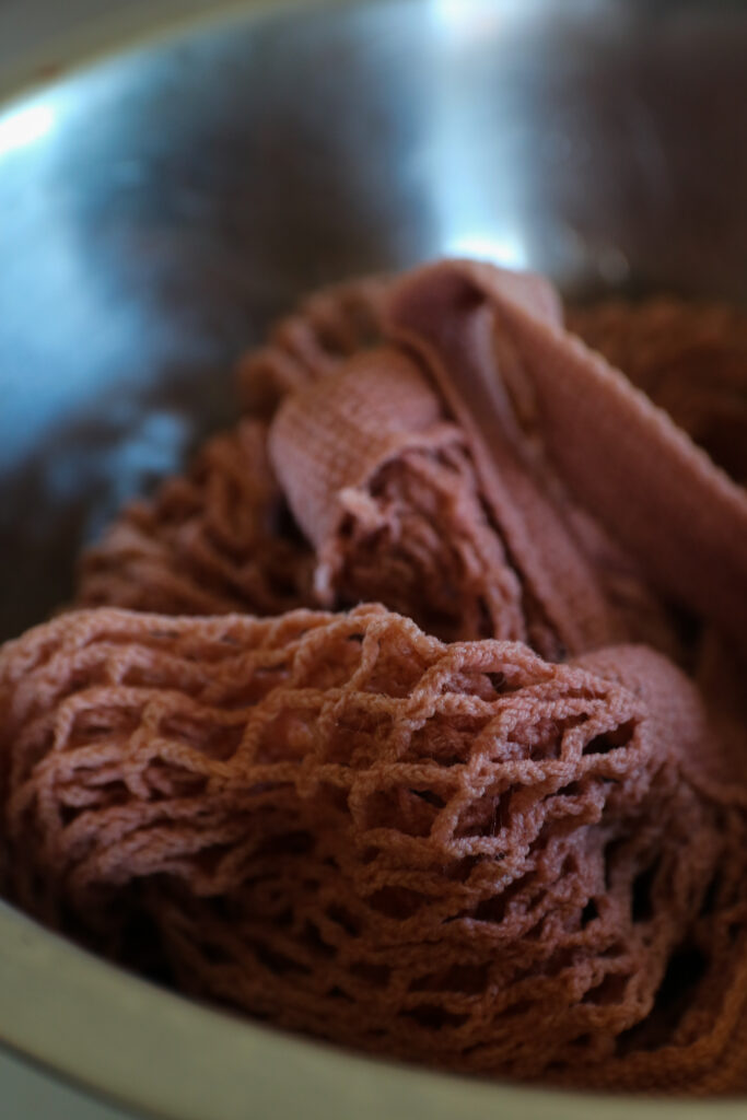 Mon but était de teindre mon filet de courses naturel en une teinte plus sympa que la teinte naturelle de base. J’avais vu que l’avocat était super pour obtenir une teinte rosé/rouge. Au bout de 40 minutes, mon filet est ressorti rose ! Je suis absolument fan de la couleur obtenue.