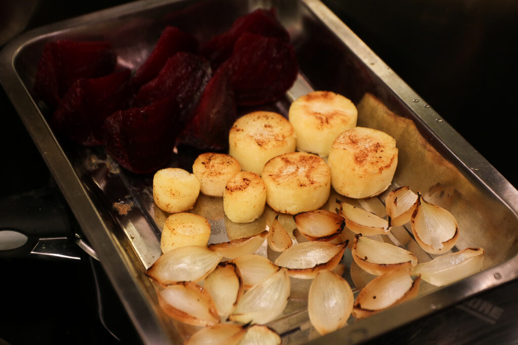 PLAT Pièce de bœuf basse température, jus de viande à la betterave, légumes du marché