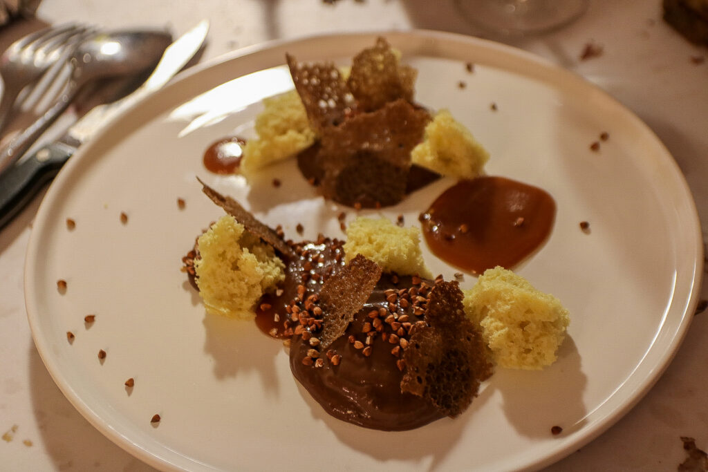 DESSERT Crémeux chocolat sarrasin, caramel beurre salé, tuile sarrasin