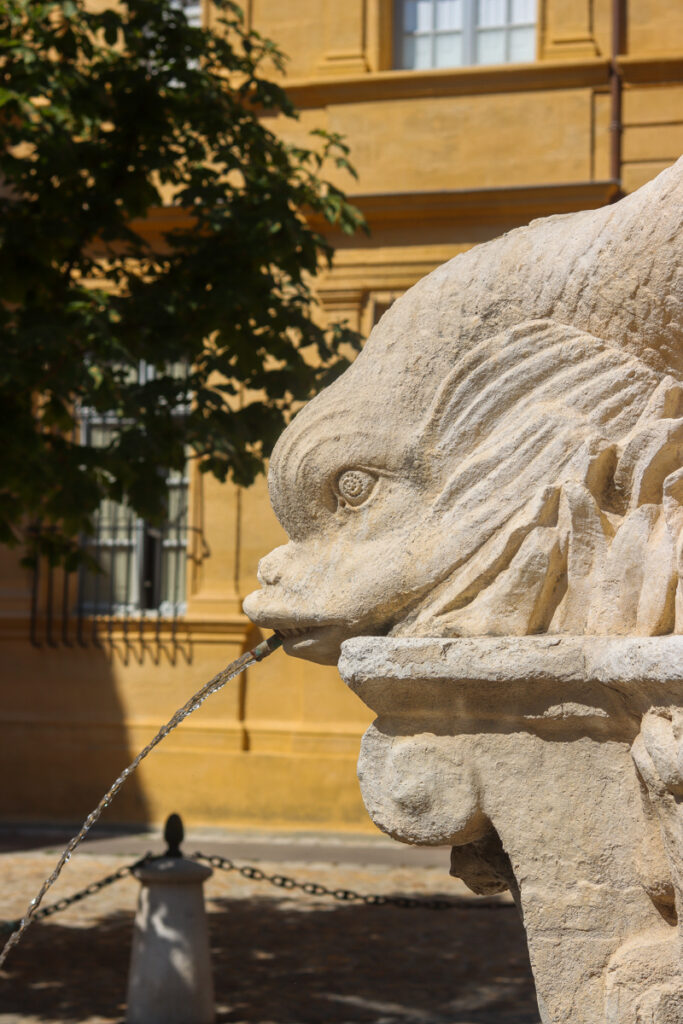 Cette fontaine se trouve dans le quartier Mazarin au milieu de la petite place du même nom : les Quatre-Dauphins. La Fontaine des Quatre-Dauphins est située au croisement des rues Cardinale et du 4 Septembre. Édifiée en 1667, à la demande du Cardinal Michel de Mazarin, c’est la première fontaine d’Aix-en-Provence construite au milieu d’une place publique! Réalisée par le sculpteur Jean-Claude Rambot, les quatre dauphins crachent l’eau dans un bassin circulaire.