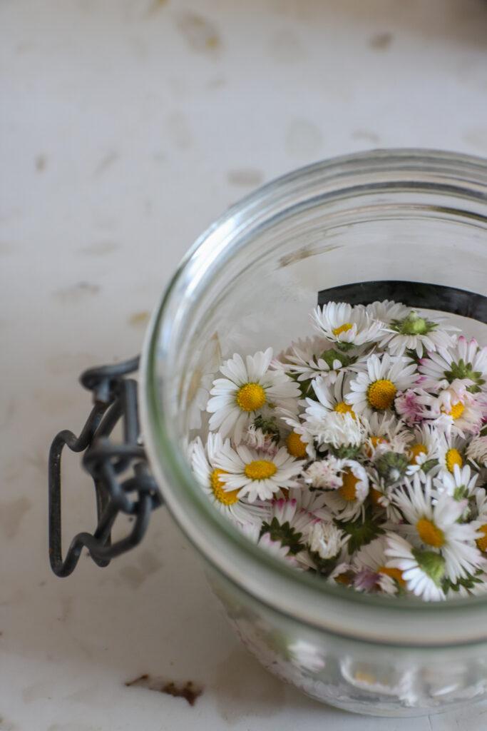 • Placez les pâquerettes fraiches ou séchées (mais jamais au soleil, elles perdraient toutes leurs propriétés) dans un bocal