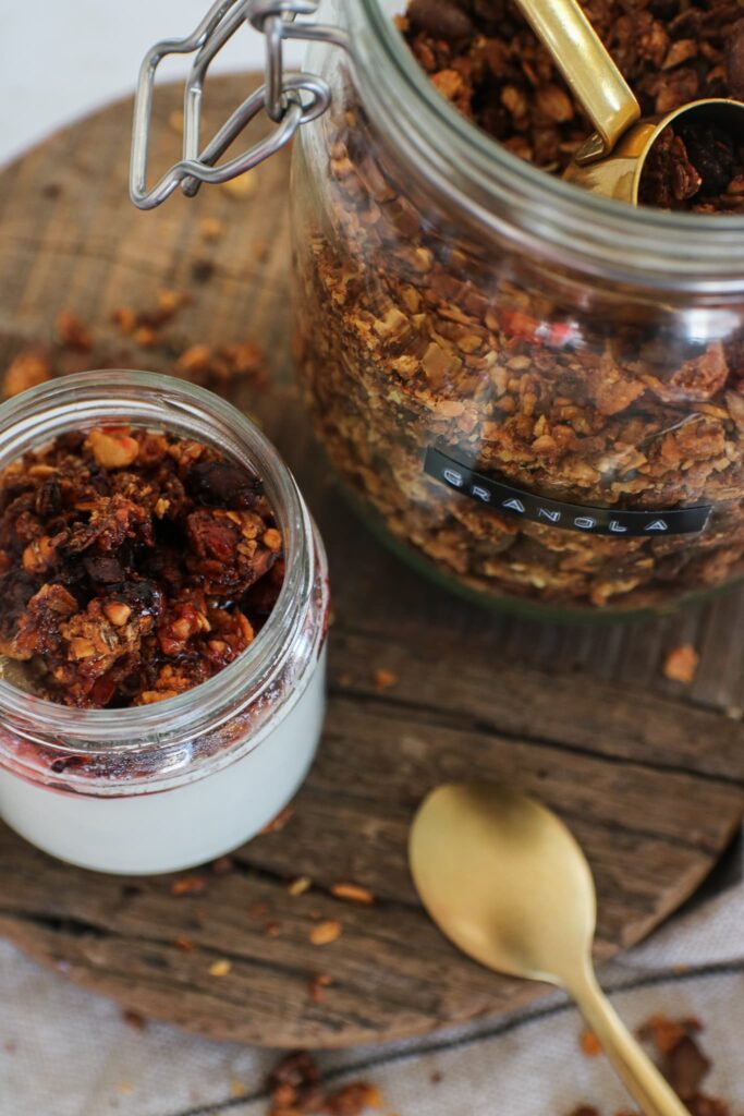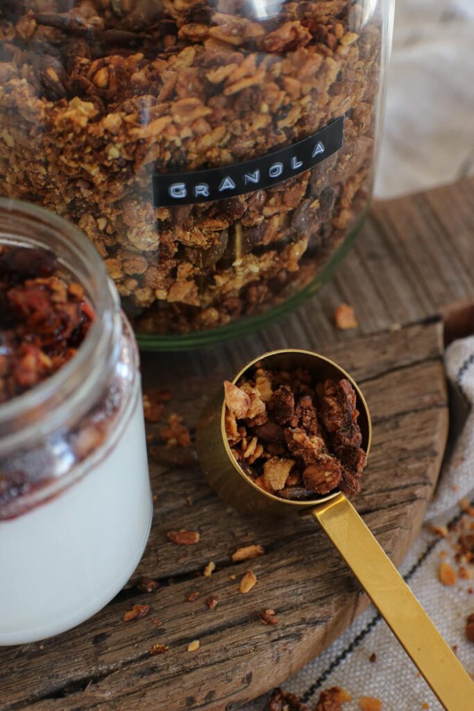 Depuis toute petite, je n’ai jamais trop aimé prendre mon petit-déjeuner. À vrai dire, j’ai très rarement faim le matin avant l’heure du déjeuner. Par contre le week-end, je ne dis pas non à un bon petit-déjeuner préparé à partir de produits frais. le combo parfait ? Un café, un bon yaourt maison, un jus d’oranges pressées, des pancakes et un bon granola healthy fait maison ! Le granola parlons-en ! Depuis que j’ai réalisé la recette de Jenny Des Papilles qui Pétillent lors d’un atelier cuisine à l’Oustaou du Luberon, j’en suis accro. J’avais donc envie de partager la recette avec vous !