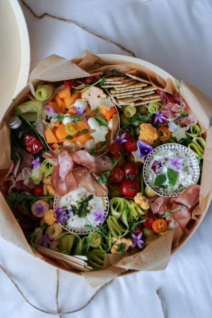 Notre Box « Dolce Vita » contenait: Charcuterie artisanale,burrata di buffala, mozzarella, ricotta dip, crudités de saison, olives marinées au pistou, crackers salés, huile d’olive AOP
